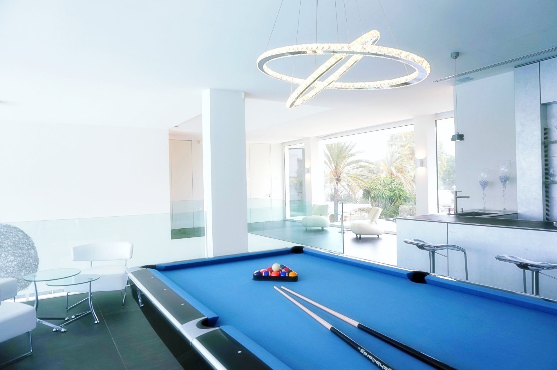 Auf der Dachterrasse kann auf 227m2 mit Bar, Chill-Out Area, Liegestühlen, Lunge Sofas, Songs Soundsystem und Lastenaufzug auch ordentlich gefeiert werden. Mit einem 360ª Blick auf Bucht und Meer, sowie Garten- und Poollandschaft können hier tolle Nächte mit Sternenhimmel genossen werden. Wer doch lieber mehr Action mag, kann auch Gebrauch von der 59m2 großen Billardgalerie machen. Diese verfügt über eine Billardloungebar mit offenem Kamin, für die richtige Atmosphäre.