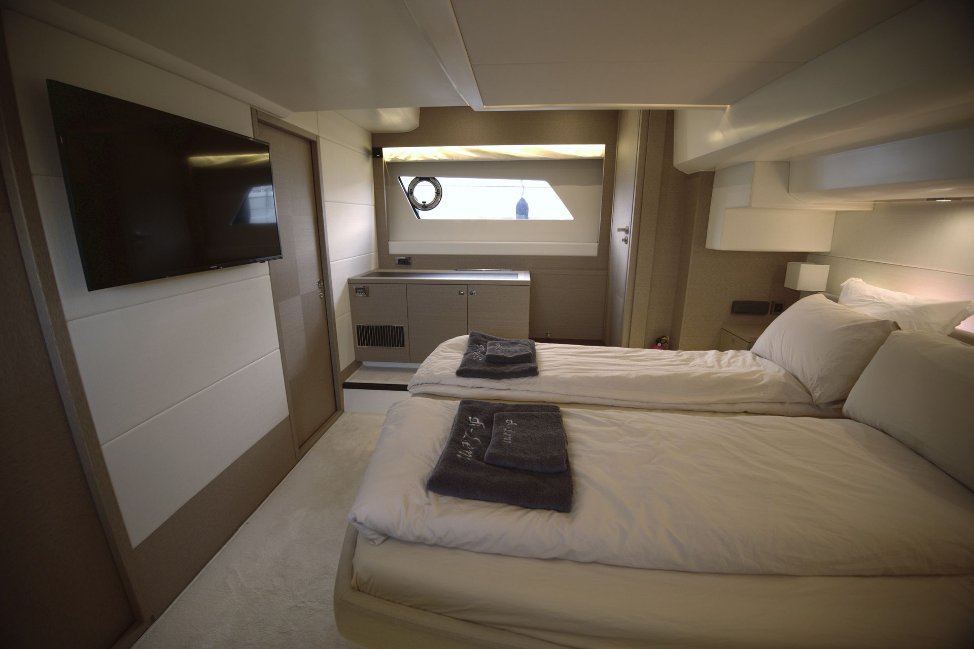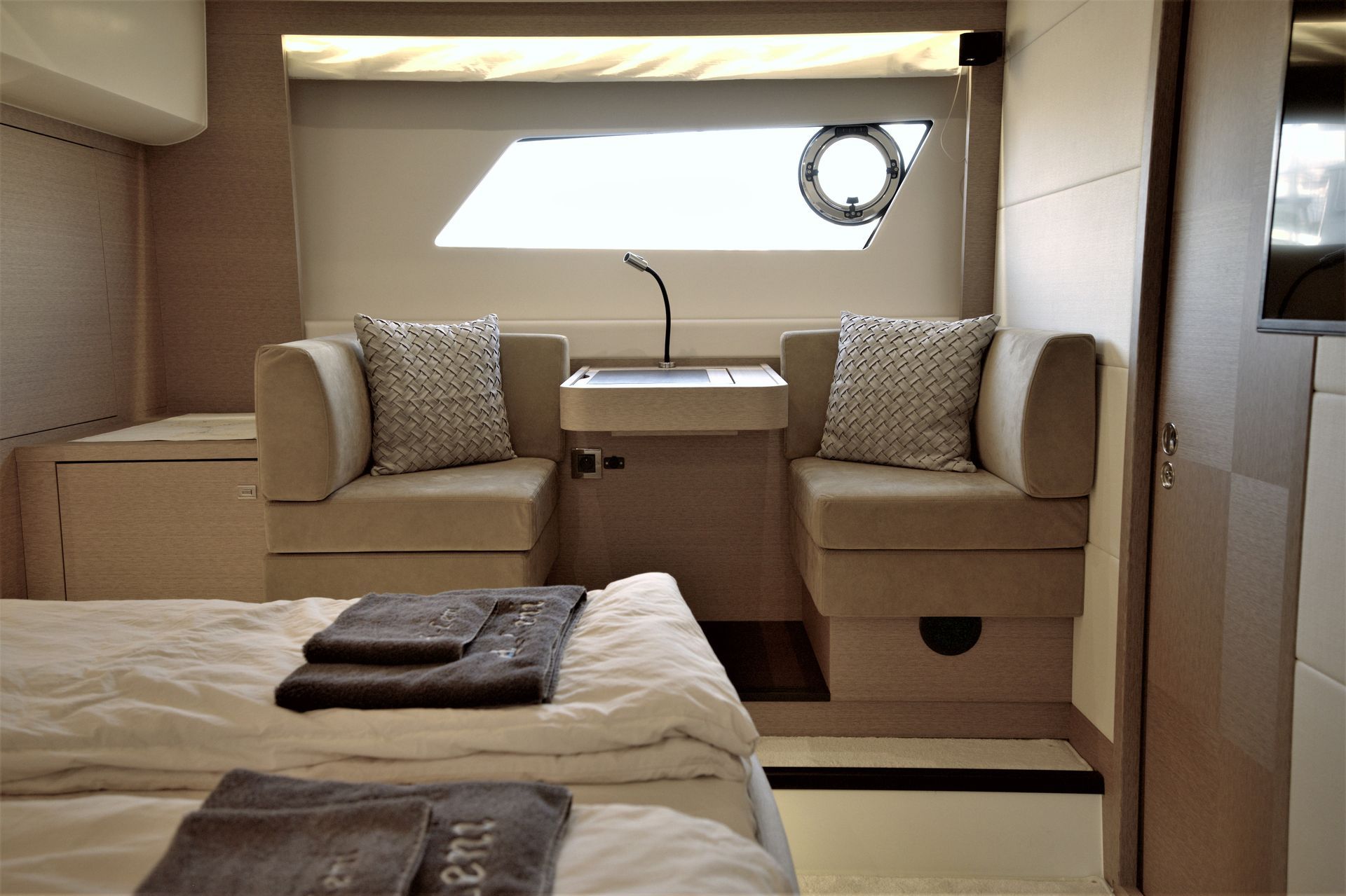 Sie verfügt außerdem über einen Cockpit-Wohnbereich mit einem großen Glasfenster und einem Glasschiebedach, welches viel natürliches Licht und einen fantastischen Blick auf das Meer bietet.